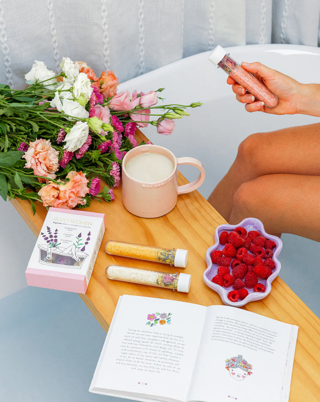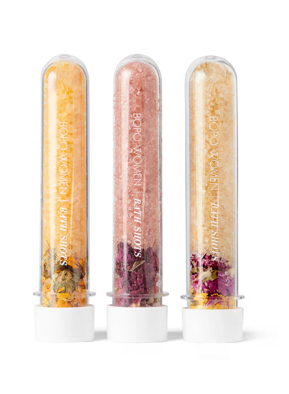 A beautiful trio of Bopo Bath Shots. Each bath shot features a 100% pure blend of essential oils, mineral rich salts, fruit extracts, clays & organic flowers. Ingredients have been carefully selected to deeply nourish skin, whilst helping you to unwind and let go. Includes a Surrender Soak, Goddess Soak & Daydream Soak.