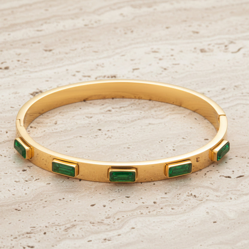 Add a touch of elegance and calm with this stunning 18K gold plated bracelet, featuring rectangle-cut green gemstones that catch the light with every move. The perfect mix of luxury and natural charm, this piece brings both sophistication and serenity to your look.