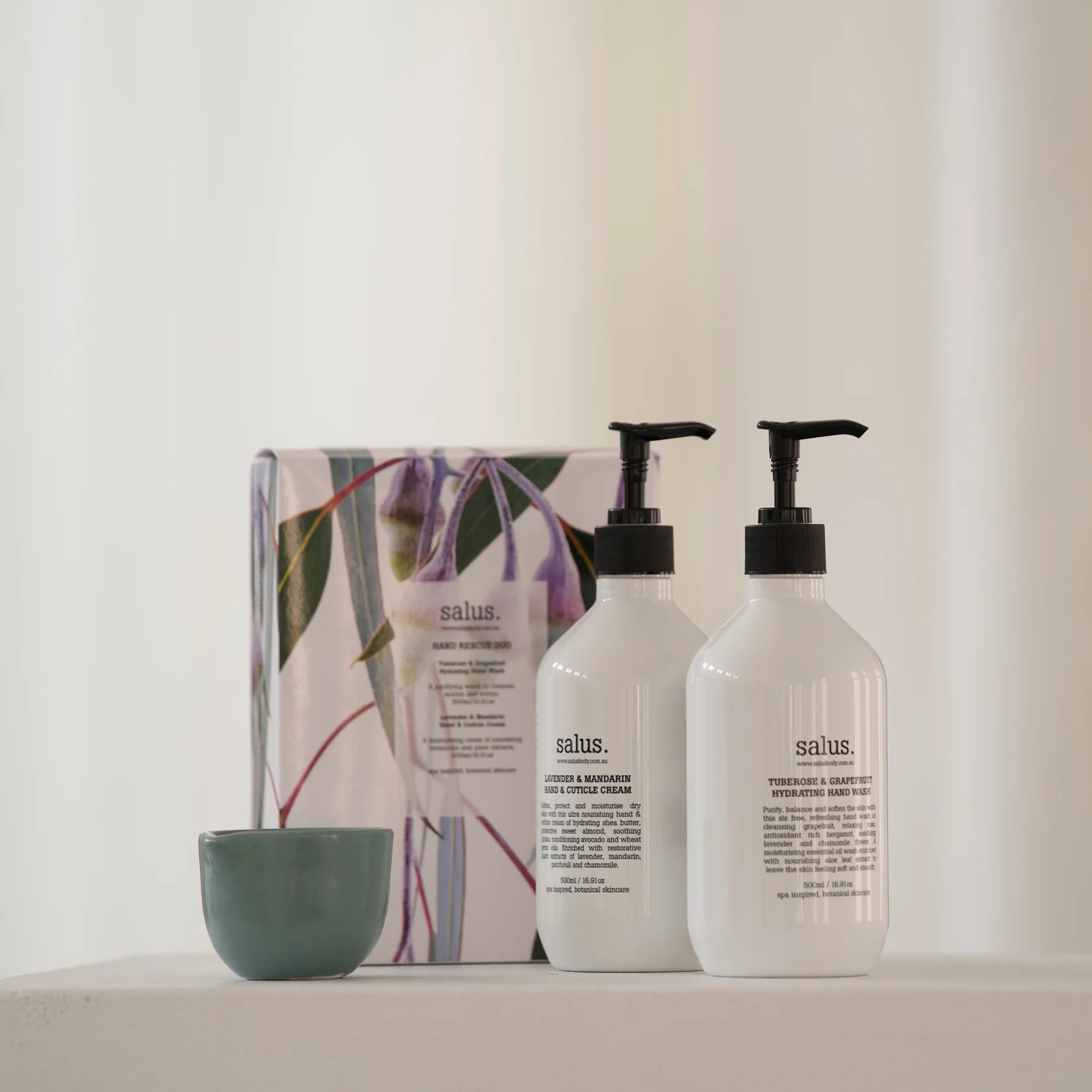 A cleansing and moisturising maintenance set to replenish and nourish dull or dry skin. With intense healing and moisturising properties this home spa kit includes a sls free Tuberose & Grapefruit Hydrating Hand Wash and Lavender & Mandarin Hand & Cuticle Cream with restorative plant extracts.