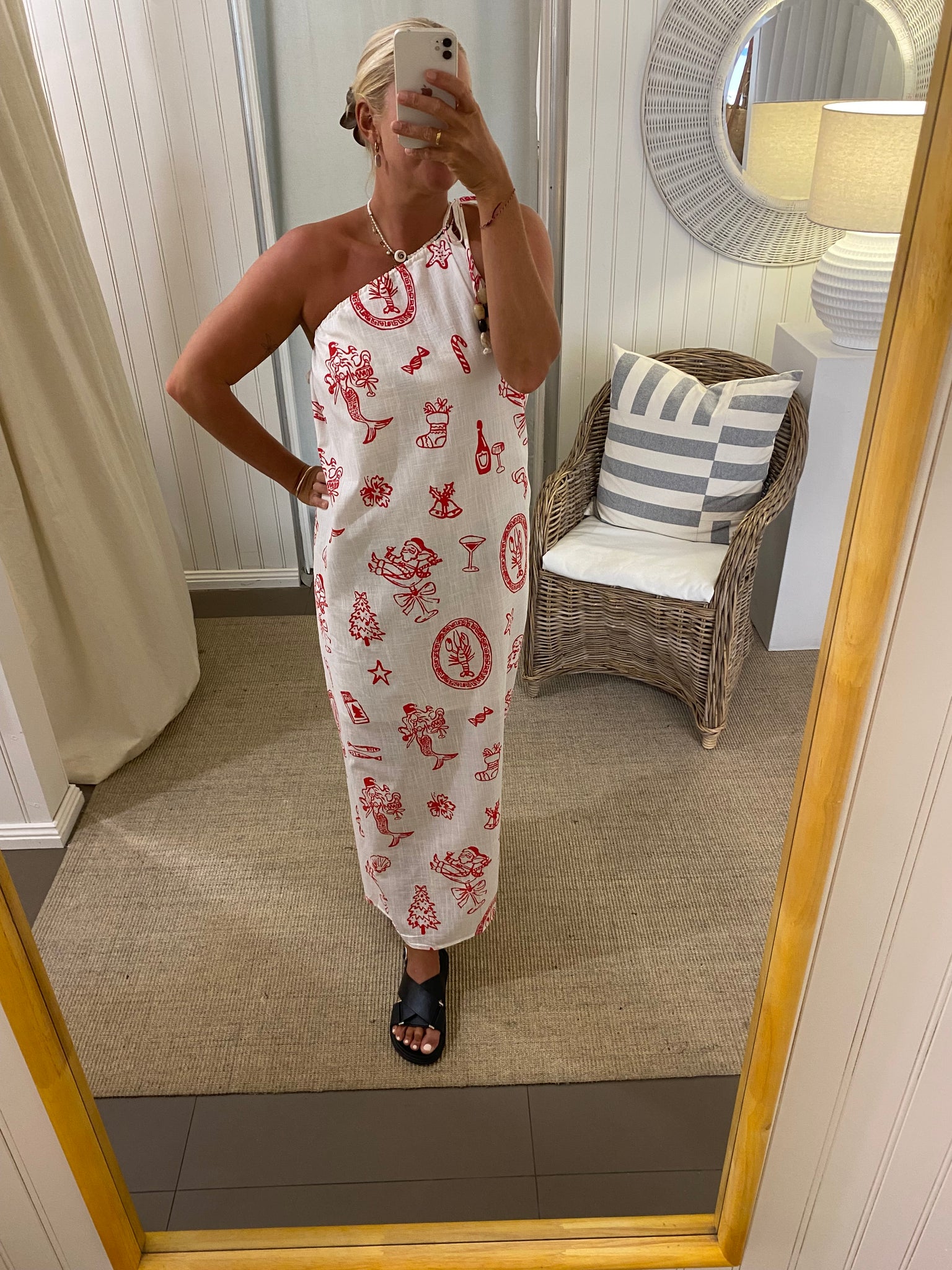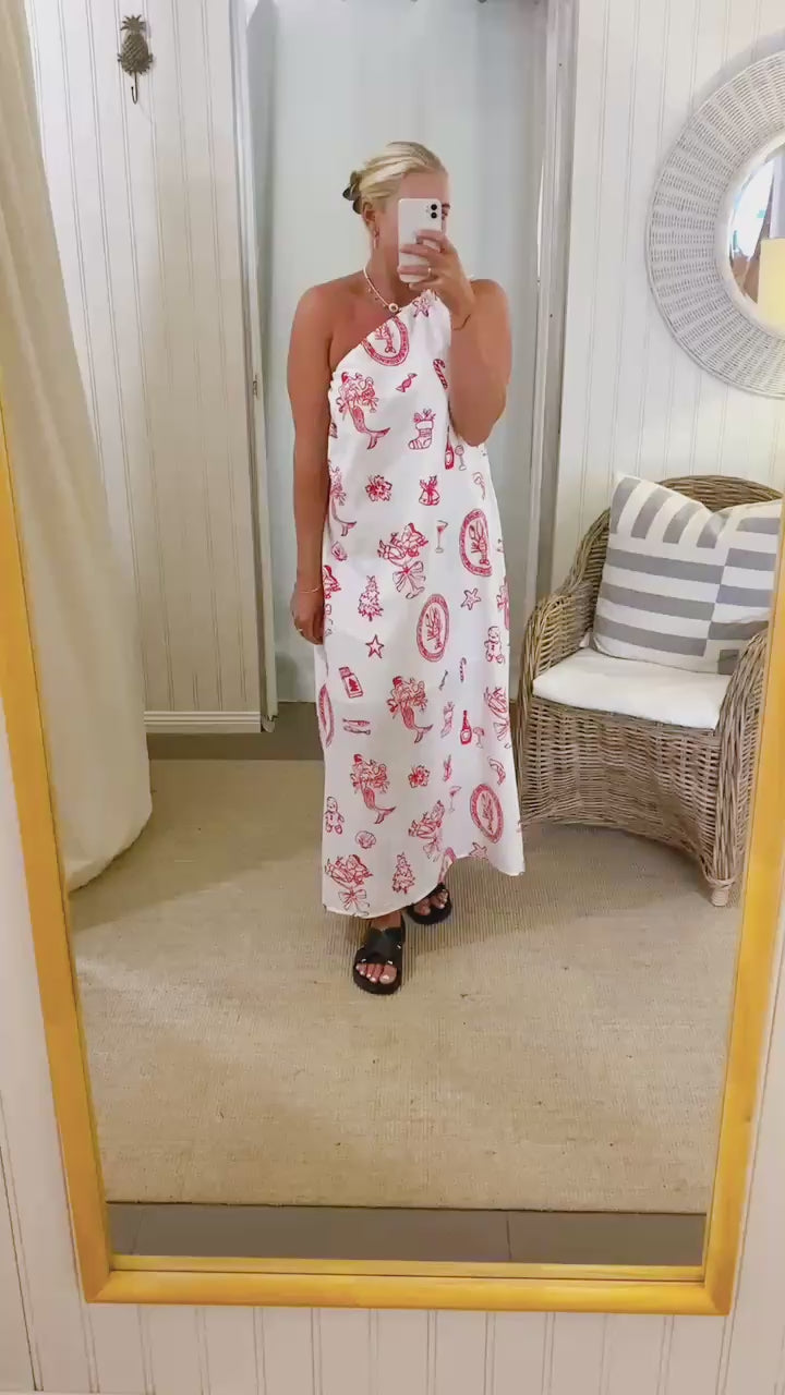 Bring effortless holiday vibes to your Christmas wardrobe with our One-Shoulder Festive Summer Dress, featuring a playful red coastal Christmas print on a lightweight, breathable cotton. This standout style offers a chic one-shoulder tie neckline, giving you a more elevated and fashion-forward option for warm Aussie celebrations.