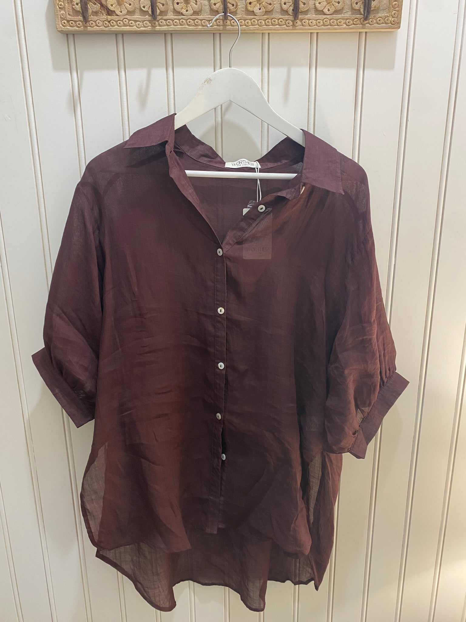 Rich and timeless, the Worthier Linen Button-Up Shirt in Chocolate is a refined essential with a modern edge. Crafted from airy linen, it features a classic collar, button-up front, and relaxed 3/4 sleeves, offering both structure and comfort.