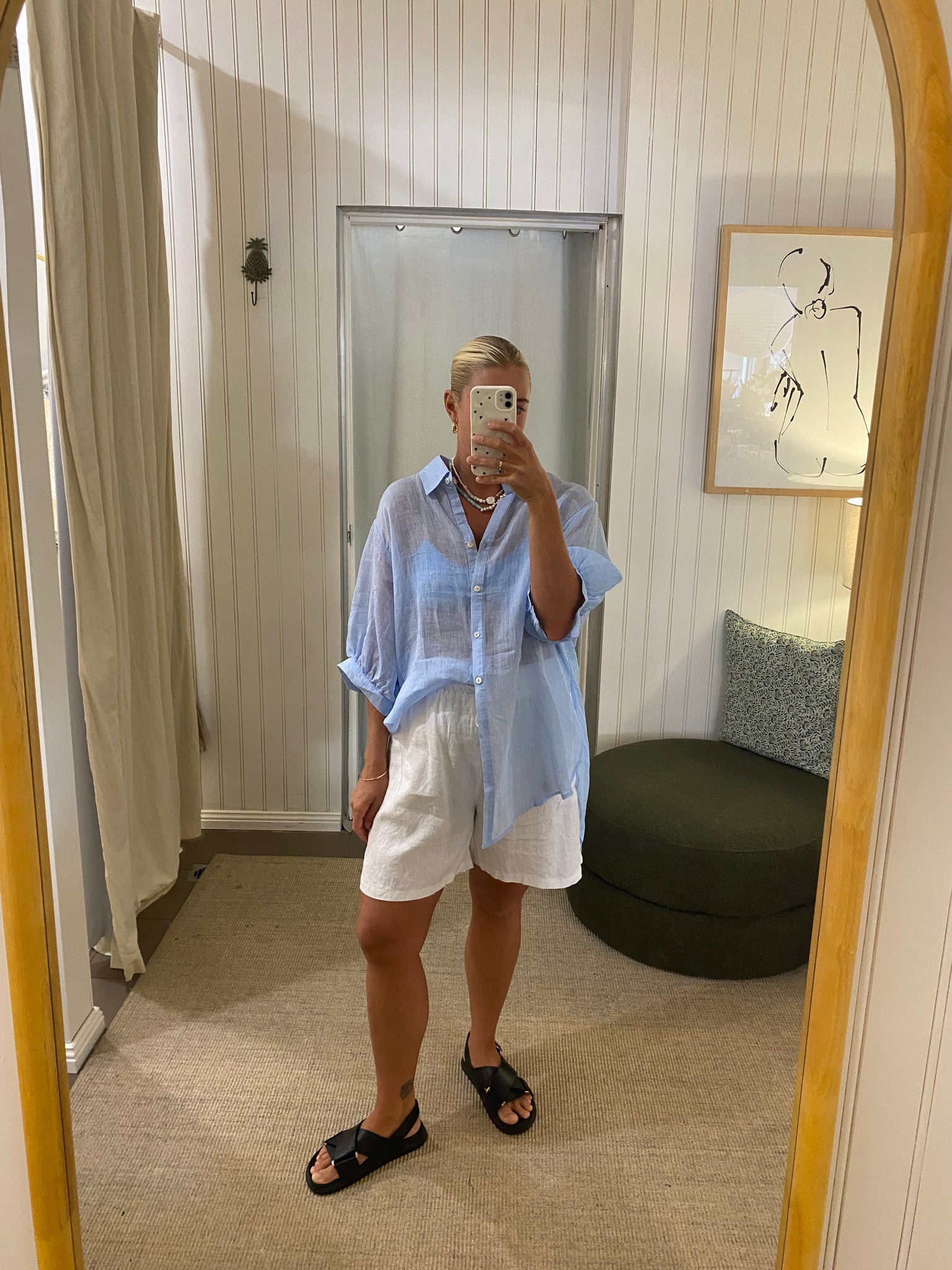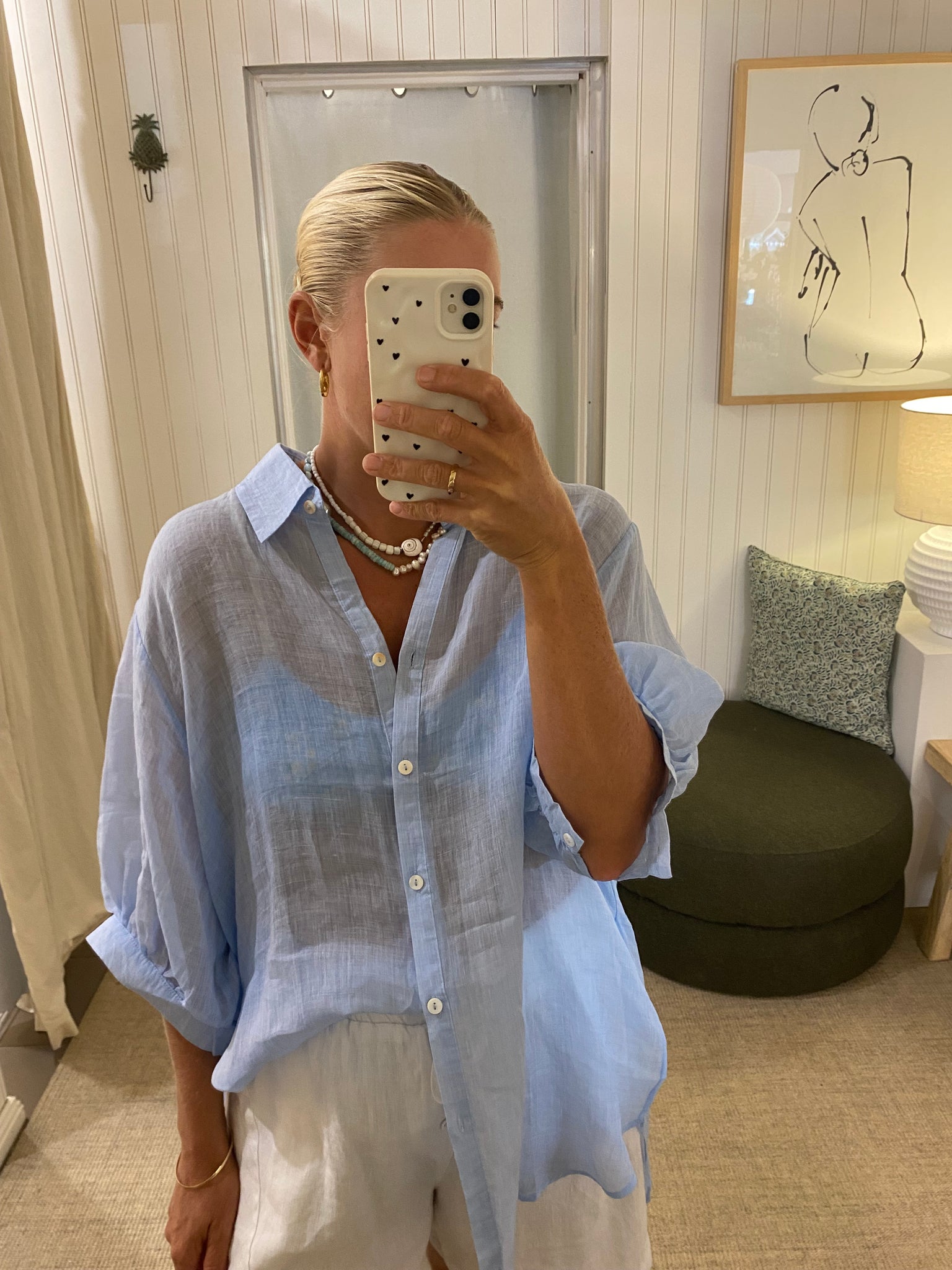 Fresh, airy, and effortlessly refined, the Worthier Linen Button-Up Shirt in Light Blue is designed for everyday comfort with a polished finish. Crafted from lightweight linen, this piece features a classic collar, a clean button-up front, and relaxed 3/4 sleeves—perfect for warm days and easy layering.